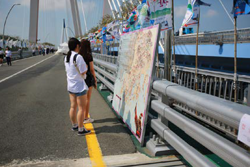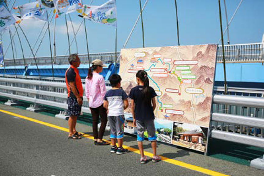 진도대교 위, 해남 → 진도 방향으로 60m 간격으로 실사판 설치 및 도 문화 해설사 배치 + 한중일 3개국 언어로 설명판 설치