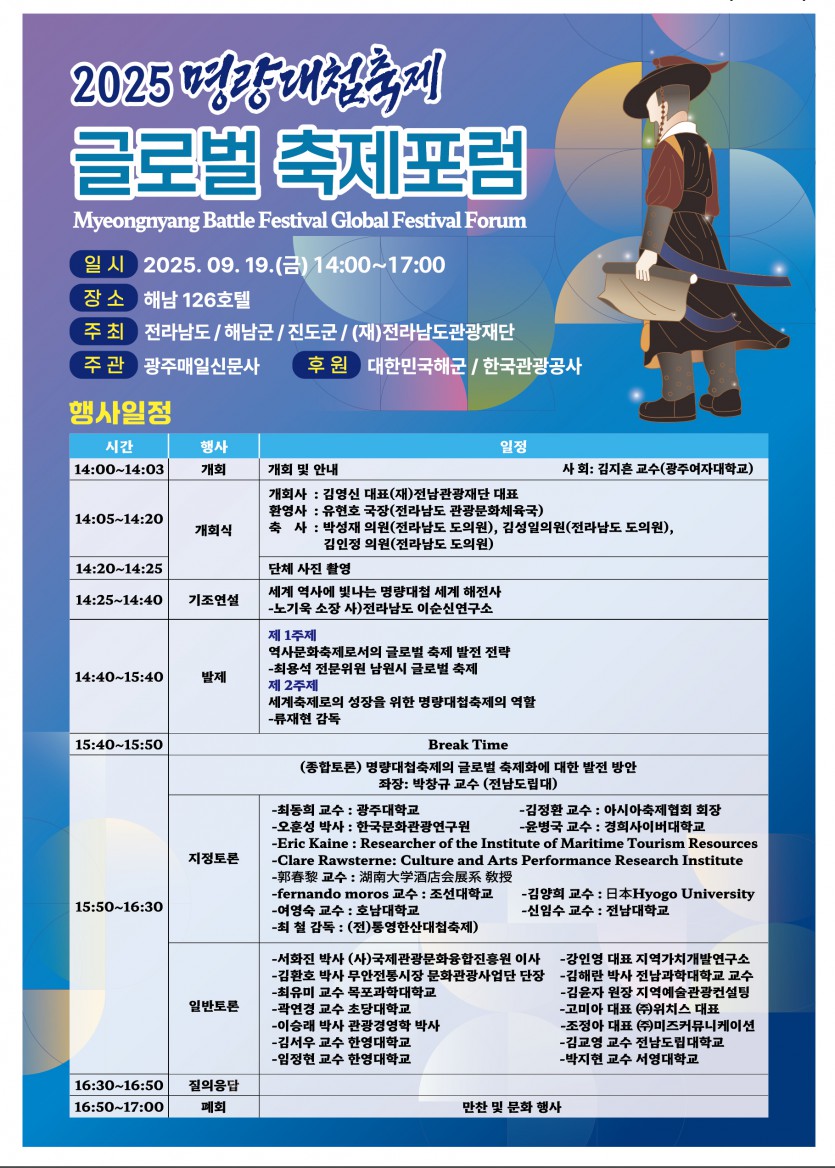 2025 명량대첩축제 글로벌 축제포럼 행사일정 페이지 정보 작성자 명량대첩 댓글 0건 조회 222회 작성일 25-09-11 09:52 본문 2025 명량대첩축제 글로벌 축제포럼 행사일정 목록 다음글2025 명량대첩축제 글로벌 축제 포럼 25.09.11 댓글목록 댓글목록 등록된 댓글이 없습니다.